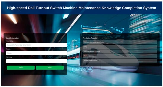 To assist maintenance personnel in effectively utilizing the completed missing information, this study developed a knowledge completion system for high-speed railway turnout switch machine maintenance using the Flask framework, as illustrated in Figure 11. By inputting an entity and relationship from the triplet, the system will automatically identify the top five missing pieces of information most relevant to the current input and rank them in descending order of relevance (displayed from top to bottom in the system interface). By completing and inferring missing information from the existing data, the system predicts equipment operating conditions, failure causes, safety hazards, and maintenance measures. This assists railway maintenance personnel in better understanding turnout failure mechanisms, supports decision making, enables preventive maintenance, and accelerates the development of intelligent maintenance for high-speed railway fault handling.