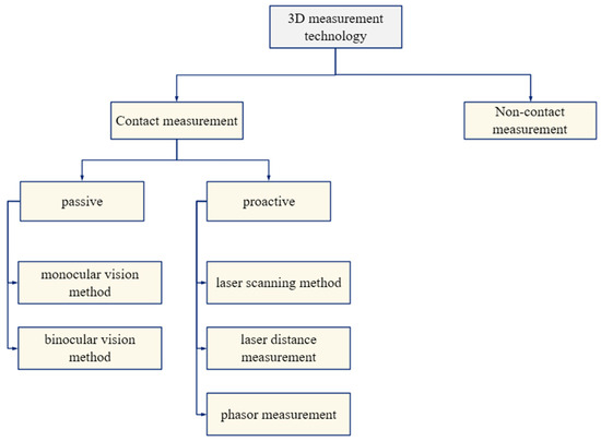 Three-dimensional measurement is a modeling technique that involves using 3D coordinates presented using precision instruments, electronic computers, digital control, optical detection, and other advanced technology [18,19]. This method is multi-faceted and hence provides high accuracy and stability irrespective of the target color or illumination conditions. However, it does have its downsides; scanning necessitates contact between the probe and the object, which may compromise the integrity of both parties, possibly leading to expanded constraints on application. In contrast, non-contact 3D measurement methods, and more specifically optical 3D measurement methods, are widely used and can be categorized as passive or active based on imaging by illuminating [20]. Figure 1 shows a basic class grouping of the 3D measurement techniques. The surveying details on each are covered in [21,22], and [23] mentions extra viewpoints on the efficiency and new developments in both contact and non-contact measurement methods.