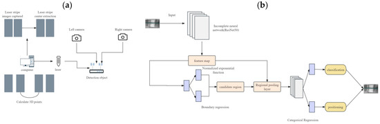(a) Principle of binocular line laser 3D scanning technology; (b) main architecture of Faster R-CNN.