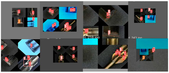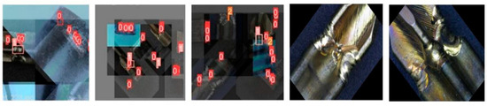 In the process of expanding the dataset, three principal data augmentation techniques that were used are as follows: (1) applied transformations that modify the location of defects in the pictures such as flipping, rotating, and panning; (2) simulated contests with adjustments made to saturation and transparency under varied lighting conditions to increase diversity in the dataset; and (3) a combination of Mosaic and Mix-up methods that can fuse different image data into new ones to further enrich the dataset. As a result of these strategies, the dataset size expanded to six times its original size, increasing the number of images to 2730 and the number of defect samples to 8058. An example of an enhanced weld defect image is shown in Figure 6.