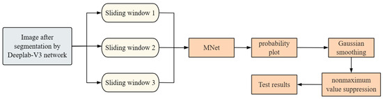 The welding detection process, as illustrated in Figure 8, integrates the MNet network proposed in this study with the Deeplab-V3 network. The MNet network performs feature extraction on the welding point image using a sliding window approach, followed by constructing an edge frame for Gaussian smoothing. Finally, recognition of the welding point is achieved through non-maximum suppression operation.