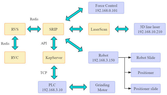 The intelligent trimming substrate for weld seams described in this paper aims to increase the quality and efficiency of welding through the complete implementation of automation technology and provides the framework for performance monitoring and data collection. The system structure is illustrated in Figure 1, where the yellow square indicates the software and the blue square identifies the hardware. Together, key hardware and the software system work to achieve accurate detection and trimming of the weld seam. Critical hardware components consist of the following: