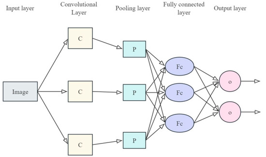 A deep learning-based Convolutional Neural Network, motivated by the fact that object features can be extracted from training samples, considers targets undergoing repeated training, and is then able to achieve target detection and recognition in various situations while maintaining robustness [47,48,49]. Deep learning considerably surpasses conventional image processing in uncovering the intrinsic relationships among feature points in an image and is equally well suited to the problem of difficult recognition due to diverse backgrounds. The underlying architecture of a convolutional neural network is shown in Figure 11.