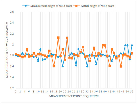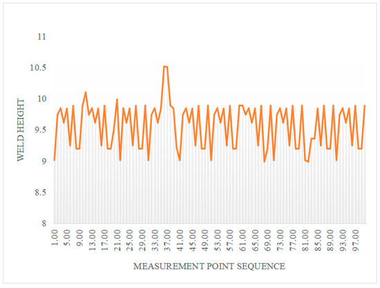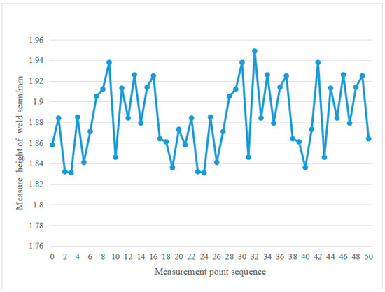 The aim of this paper was to examine the welding of thin aluminum alloy plates, with emphasis on weld point positioning tests and three-dimensional space geometry tests. The research emphasizes a repeated measurement taken one time. Accurate and steady measurement of the height of the weld is significant for the process of automatic welding, grinding, and polishing. Therefore, this project conducted multiple repeated measurements at the same position for each point. The average error among 50 welding points is 1.89 mm, with a standard deviation of 0.03 mm and a maximum–minimum difference of 0.13 mm (see Figure 9). It can be observed from Figure 13 that this method demonstrates good repeatability and relatively stable dynamic characteristics.