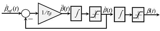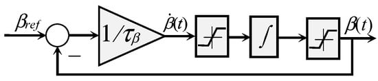The electromechanical nature of the wind energy converter typifies that the system has very different time constants. Mechanical components have large inertia with slow reaction times, while electrical devices are very fast. On the other hand, pitch drivers are situated in between, i.e., they are faster than the mechanical subsystem but slower than the electrical one. These considerations about the time constants justify the idea of using a very simple model for the pitch actuators. Hence, first-order models are often used to this end, as reported in, e.g., [7,8,9]. A typical first-order model for a pitch actuator is formulated in [10] as follows: