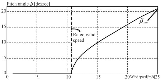 Parameters ζ and ωn are the damping ratio and the eigenfrequency, respectively. Tt is the dead time. Depending on the wind turbine dynamics, the damping ratio can vary between 0.6 and 0.9 and the eigenfrequency between 8.88 and 11.11 rad/s (see, for instance, [15,16,17]). Notice that βmax is the maximum amplitude constraint, which is selected to keep constant the rotor speed for the maximum wind speed. A typical dependence between wind speed and pitch angle is depicted in Figure 5. βmax must be changed to 90 degrees in the shutdown operational state.