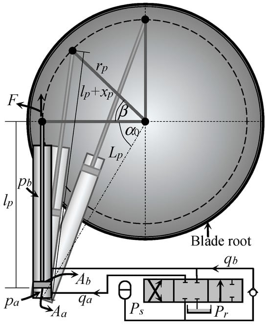 Fp is the piston force, rp is the actuator torque arm, xp is the piston rod position, and β is the pitch angle. With the help of Figure 7, the relationship between xp and β can be derived and expressed as follows:
