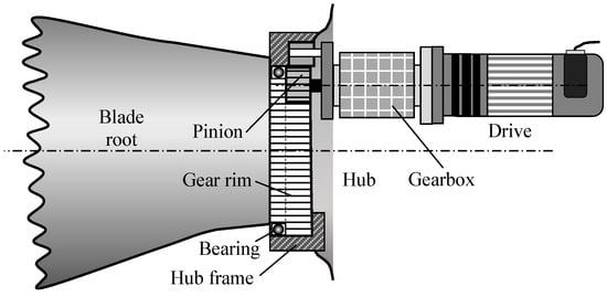 In essence, an electrically driven pitch actuator comprises a gearbox coupled with an electrical motor. It is coupled with the blade root through a pinion that engages with a bearing and a gear rim. A scheme of such an actuator is depicted in Figure 8.