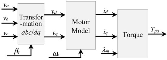 The three-phase input voltages are denoted by [va vb vc]T. The electrical speed is ωe, and the electrical rotational angle is βe. The electrical parameters are Lq and Ld as the self-inductances, λm as the flux linkage between the stator and the rotor, and Rs as the stator resistance. Finally, the electrical torque with p as the number of pole pairs is given by