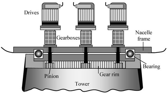 The principal objective of the yaw subsystem is the maximisation of the captured energy via maintaining the machine orientated in the direction of the wind by means of accurate direction tracking. Although hydraulic yaw actuators are possible, they are essentially electric. Hence, yaw systems comprise multiple electric motor drives synchronised by a common control signal. In essence, yaw drives use the same concept as electric pitch drives, including an electric motor, gear rim, pinion, and planetary gearbox. Furthermore, the yaw rim and yaw brakes are attached together in order to secure the rotor remains in its 90-degree orientation with respect to the wind direction or during maintenance procedures. The yaw mechanism commonly provides a considerable yaw torque to move the nacelle. A schematic representation of a six-driver yaw system is shown in Figure 11, where three drives are maintained behind the visible ones to improve the legibility of the diagram.