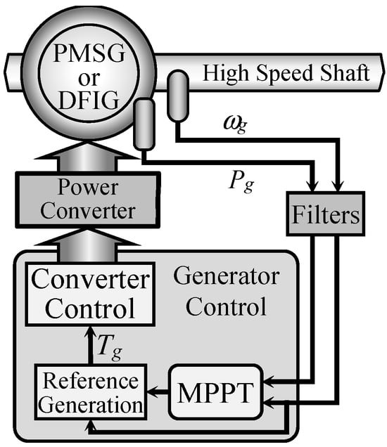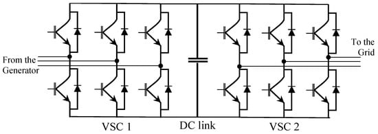 Hence, the power converter serves as an interface between the control system (MPPT, maximum power point tracking) and the generator, fulfilling the role of an actuator. There are several types of power converters, depending on the generator type. Modern wind turbines have attached either a permanent magnet synchronous generator (PMSG) or a double-fed induction generator (DFIG). In both cases, bidirectional back-to-back power converters are used, although connected differently. A schematic back-to-back power converter is shown in Figure 13.
