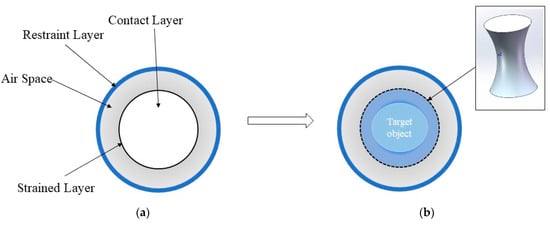 Gripping principle of envelope-gripping SFLG. (a) Before deformation, blue constraint zone, restricting the outer deformation; gray indicates the gas cavity; black coil indicates the strain zone, which is deformed; and in the inner white area the grasping behavior is realized. This figure is only a schematic diagram representing the design of the fingerless soft gripper and does not represent its dimensions. (b) After deformation, when the gas enters the gas cavity and acts on the strain zone, the strain zone has a shaded blue deformation, and the upper-right corner is a three-dimensional view of the deformation that occurs in the strain zone.
