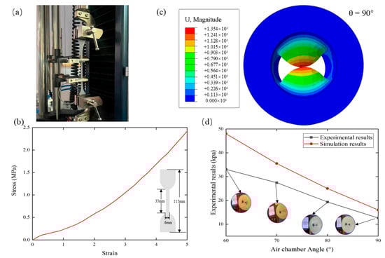 Tensile test and finite element calculation. (a) Tensile test by USA-MTS-E45.105 electronic universal tensile machine; (b) tensile test results with a dumbbell shape as the test specimen; (c) finite element calculation of the soft gripper when the air cavity angle is 90°; and (d) experimental and finite element calculations of the air-pressure value when contact occurs between the SFLG of the two air cavities.
