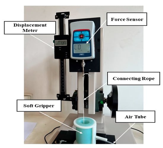Under different pressures, for the capacity to load objects with different sizes, we chose the same sphere with different sizes. Taking into account the gripping range of the three kinds of grippers, the diameter of the sphere is 8–24 mm. The soft-gripper-tension-test device is shown in Figure 9, and the clamped sphere is connected to the force sensor by a rope and the lower end of the soft gripper is fixed. When the soft gripper being tested is inflated and firmly grips the sphere, the force sensor moves linearly along the top to test the tensile force at different pressures and with different sphere sizes.