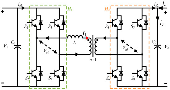The dual active bridge (DAB) topology was first proposed in the early 1990s [1] and has since been recognized as a key circuit for the next generation of high-frequency link power conversion systems [2,3]. Without a power frequency transformer, it has the characteristics of light weight and small volume. In addition, other advantages of DAB converters include bidirectional power transmission capability, high power density, etc. [4]. Nowadays, DAB converters serve diverse applications, such as energy storage systems with batteries [5], back-to-back systems [6], solid-state transformers [7,8], electric vehicles (EVs) [9], and so on.