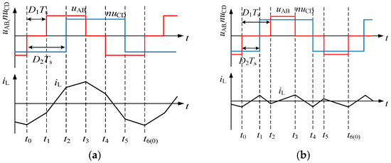 Taking the waveform in Figure 2a as an example, we analyze the inductor current. The inductor current is symmetrical within one cycle: . Combining with Formula (1), the expression for the inductor current can be obtained as follows: