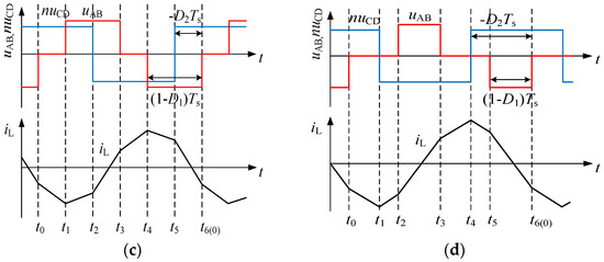 TS is a switching period, fS = 1/(TS) is switching frequency, and D1 and D2 are the inner and outer phase-shift ratios in half a switching period. Under EPS control, the converter can operate in two main working modes depending on the different configurations of the displacement ratio D. D1 is the inner phase-shift ratio between the trigger pulse of S1 and S4. D2 is the outer phase-shift ratio between the trigger pulse of S1 and S5. The conventional operating states of DAB converters under EPS control can be clearly classified into four conditions: one is ; the second is . And considering that DAB can achieve bidirectional power flow, there are four working modes in total: the relationship between the D1 and D2 of the other two conditions, namely, and . The steady-state waveforms of the four modes are shown in Figure 2, including the AC side voltage and inductor current. It can be inferred that the distinct power flow directions characterize the various modes. Maintaining a stable output voltage is challenging due to potential fluctuations. To assess the impact of voltage fluctuations on the output side, the concept of the voltage conversion ratio is utilized, and we define its expression as . When k > 1, DAB operates in boost mode.