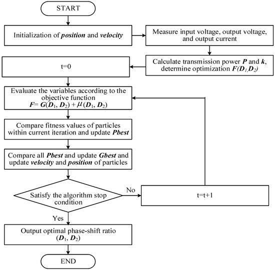 Extended-phase-shift (EPS) modulation strikes an effective balance between complexity and flexibility. It incorporates two control variables that enable the DAB converter to perform optimally in various respects, including current stress. However, traditional modulation schemes result in large current stress and poor dynamic response performance, which increases the converter losses and shortens the converter’s lifespan [14,15,16,17]. Hence, obtaining the optimal phase-shift ratio of EPS modulation to minimize current stress is of great significance. Various sophisticated iterative techniques have been proposed to determine the optimal phase-shift ratios for EPS modulation, including the Lagrange multiplier method [18], mathematical programming [19], Newton’s method [20], and genetic algorithms (GAs) [21]. However, these approaches have certain drawbacks, such as reliance on initial conditions, varying model knowledge demands, significant computational load, and challenges in achieving global optimization. To address these limitations, refs. [22,23] introduced different ways to obtain the optimal phase-shift ratio of EPS modulation to small current stress and to increase the life span of devices. However, the control process of the above two control methods is complicated and requires an extensive calculation process. Furthermore, dynamic performance serves as a vital indicator for converters. The aforementioned article primarily focuses on enhancing the static performance of converters, including current stress considerations. In recent years, particle swarm optimization (PSO) algorithms have made substantial progress, especially in the field of power electronics, where PSO-based optimization algorithms are commonly used for control, modeling, and optimization [24,25]. However, they ignore how to improve the dynamic performance of converters while ensuring that current stress remains minimized. Hence, this article aims to minimize the current stress of the DAB converter and, at the same time, to improve the output voltage performance of the DAB converter in the face of disturbance.