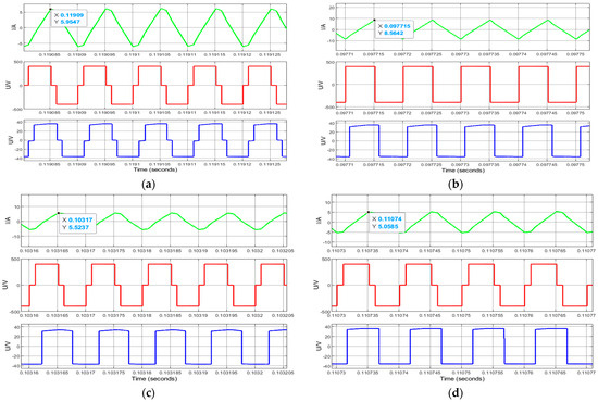 AC side voltage and inductor current of DAB converters under the EPS control method: (a) mode I, ; (b) mode II, ; (c) mode III, ; (d) mode IV, .