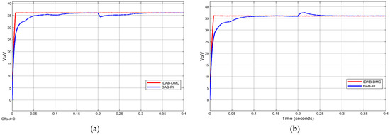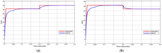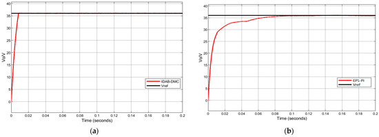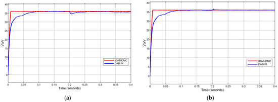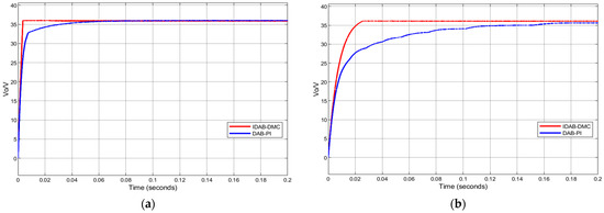 To verify the improvement of dynamic characteristics, the extended phase-shift DAB simulation waveform under traditional PI control and the extended phase-shift DAB simulation waveform under IDAB-DMC control were compared. When the input voltage is 400 V, the reference voltage is 36 V, and the load is 7.5 Ω. Figure 8 shows the starting waveform of the output voltage of the converter under two different controls.