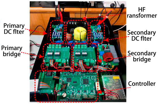 The system parameters of the DAB converter for hardware implementation are given in Table 2. To verify the correctness of the theoretical analysis in this article and the effectiveness of the proposed control strategy, this section combines simulations and uses a DSP model TMS320F28335 (Texas Instruments, Dallas, TX, USA) as the main controller to build an experimental platform, as shown in Figure 13.
