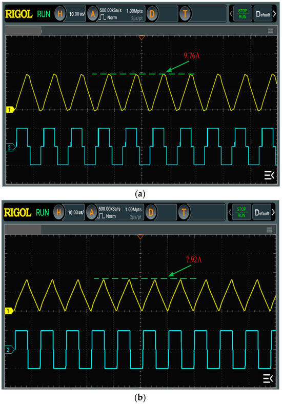 To verify whether the IDAB-DMC control strategy improves performance in actual circuits, comparative experiments were conducted on PI control and IDAB-DMC algorithm control on the established experimental platform. Figure 14a,b show the oscilloscope waveforms of the steady-state current stress of the converter under two different controls.