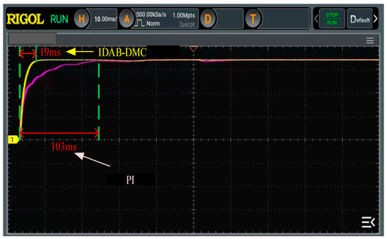 As shown in Figure 16, the starting time of the DAB converter under traditional PI control is 103 ms, while under IDAB-DMC control, it only takes 19 ms to reach the steady-state output voltage value. The comparison of the starting speed between the two controls is obvious. Therefore, the IDAB-DMC algorithm can significantly improve the startup speed of DAB converters.
