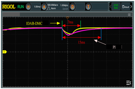 From Figure 11, we can conclude that when the reference voltage suddenly decreases or increases, the response time of the output voltage following the reference voltage under PI control is 40 ms and 55 ms, respectively. However, IDAB-DMC almost instantaneously follows the given value during the sudden decrease, and it only takes about 5 ms during the sudden increase. The dynamic response time comparison between the two is obvious.
