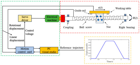 As shown in Figure 1, the structure diagram of the ball screw feed system is shown. As a mechanical transmission device, it is mainly composed of a servo motor, coupling, ball screw and workbench. When the servo motor receives the output signal of the controller, the rotational torque generated by the servo motor drives the coupling to drive the screw to rotate. The ball screw and the workbench are connected by nuts, and the rotational motion of the screw is converted into the reciprocating linear motion of the workbench [28,29,30].