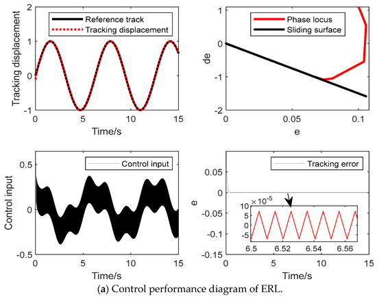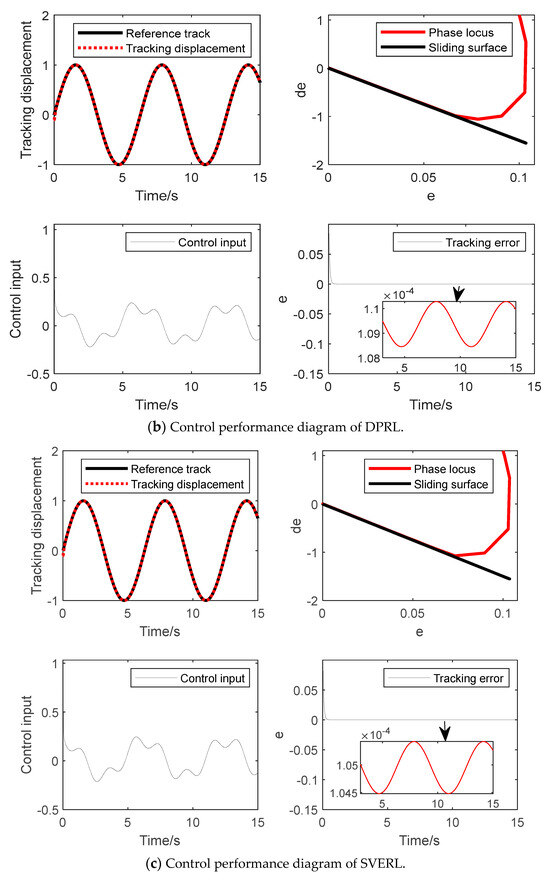 When , compared with DPRL, SVERL adds to improve the approaching speed of the system when it is far away from the sliding surface. When approaches 0, the state variable can adaptively adjust the approaching speed, which effectively reduces the chattering. However, the addition of the exponential term also increases the control gain of the system and reduces the transient response performance of the system.