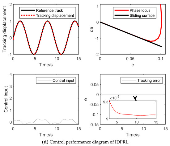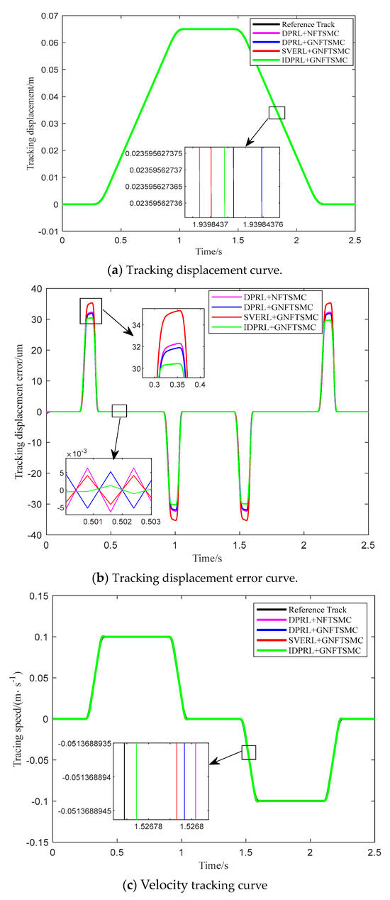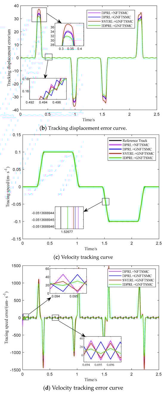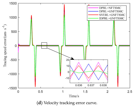 From Figure 4a,b and Table 2, it can be seen that the displacement error performance evaluation function value of DPRL + GNFTSMC is 2.819, which is 14.81% higher than that of DPRL + NFTSMC. It is proved that the global sliding mode factor can effectively improve the tracking accuracy of the system. The maximum error values of DPRL + GNFTSMC and SVERL + GNFTSMC are 32.021 um and 35.824 μm, respectively. Although SVERL can reduce the chattering of the system, it will increase the maximum error value of the system. The displacement error performance evaluation function value of IDPL + GNFTSMC is only 1.371, which is 36.40%, 51.37% and 58.57% higher than that of SVERL + GNFTSMC, DPRL + GNFTSMC and DPRL + NFTSMC, respectively. IDPL + GNFTSMC maintains high tracking accuracy in each period of forward feed.