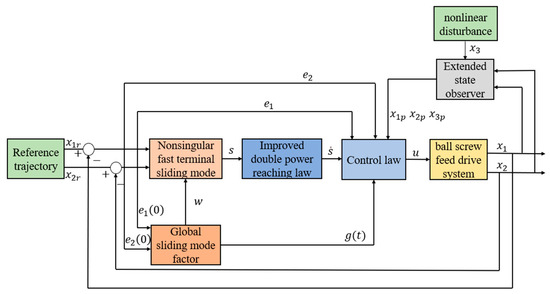 For the ball screw feed system, a global nonsingular fast terminal sliding mode control strategy is designed in this paper. In Figure 3, the global nonsingular fast terminal sliding mode control frame diagram based on the improved double power reaching law is shown [34].