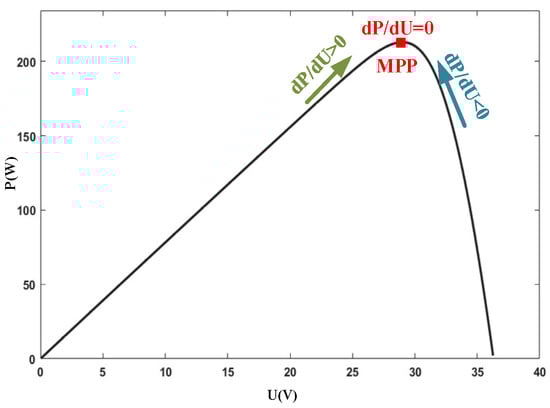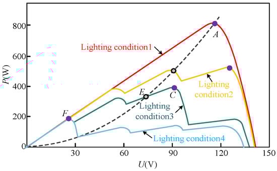 The P-U characteristic curves of the photovoltaic array are shown in Figure 2. The gray curve is the equivalent resistance load characteristic curve corresponding to MPP under standard conditions. From Figure 2, the four lines in the graph represent P-U curves under four different lighting conditions, and each point represents an extreme point on the corresponding curve, it can be seen that the photovoltaic array will have multiple extreme points in the case of local occlusion. The classical perturbation based MPPT algorithm may mistakenly identify one of the multiple extreme points as the maximum point, resulting in a loss of success rate. Therefore, using the photovoltaic characteristic curve law to improve the MPPT algorithm with a stronger global search ability can effectively solve the problem.