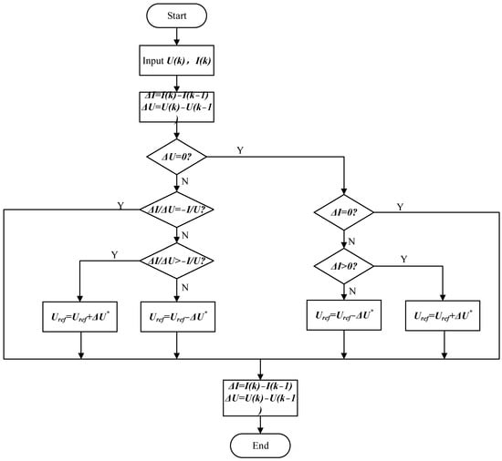 The incremental conductance method has demonstrated significant stability in the maximum power point tracking control of photovoltaic power generation. This method can accurately adapt to external environmental conditions, such as changes in irradiance, and achieve effective response to environmental changes. Its tracking effect is not affected by the performance characteristics of the photovoltaic module or the specific parameters of the battery, ensuring robust tracking of the optimal power point by the system. The flowchart of the incremental conductance method is shown in Figure 5.