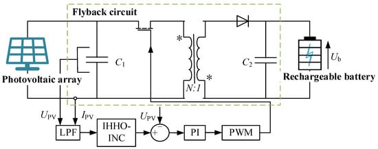 Based on the above analysis, when designing a photovoltaic power generation system, isolation requirements are important. According to reference [], this design employs an isolation DC–DC converter. The system structure diagram of the isolated photovoltaic maximum power point tracking mode is shown in Figure 6.