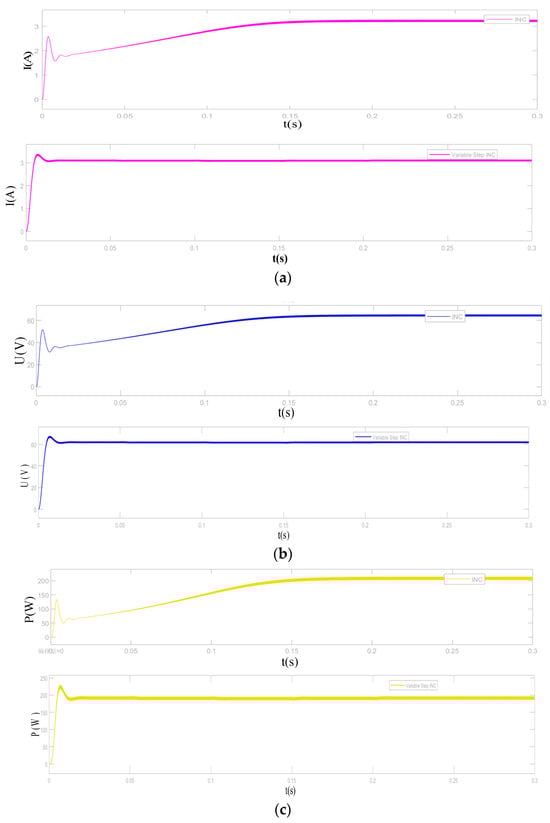 Firstly, the traditional MPPT control algorithm was simulated and analyzed under the standard conditions of S = 1000 W/m2 and T = 25 °C. The simulation results obtained for a single photovoltaic array are shown in Figure 8. The I curves under variable step conductance increment method and incremental conductance method (INC) are shown in Figure 8a, Figure 8b shows the U curves under the two methods, and Figure 8c presents the P curves under the two methods.