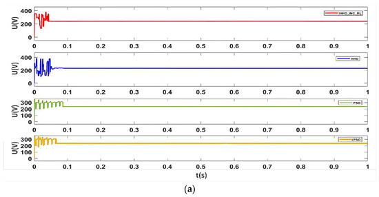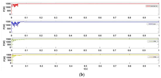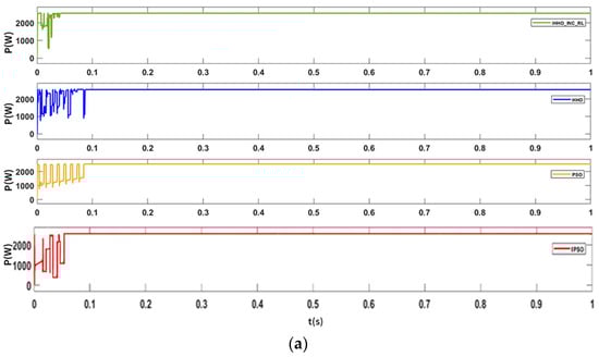 From Figure 9a,b, it can be seen that the PSO, IPSO, HHO, and IHHO-INC algorithms can all track the maximum power point under uniform irradiance, with particle swarm optimization algorithm tracking the maximum power point of 2550 W in 0.09 s; IPSO tracking the maximum power point of 2552 W in 0.05 s; Harris Eagle algorithm tracking the maximum power point of 2555 W in 0.08 s; IHHO-INC composite algorithm tracking the maximum power point of 2557 W in 0.04 s, and the actual maximum power of the system in this environment was 2557.18 W, with a tracking accuracy of up to 99.97%.