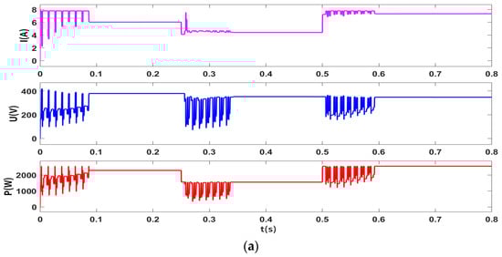 Finally, the PSO, IPSO, HHO, and IHHO-NIC algorithms were simulated and validated in a non-uniform irradiance and irradiance mutation working environment. The irradiance of the photovoltaic array was set to 1000 W/m2 within 0–0.25 s, 600 W/m2 within 0.25–0.5 s, and 1000 W/m2 within 0.5–0.8 s to simulate dynamic shading conditions. The output current, voltage, and power curves are shown in Figure 11.