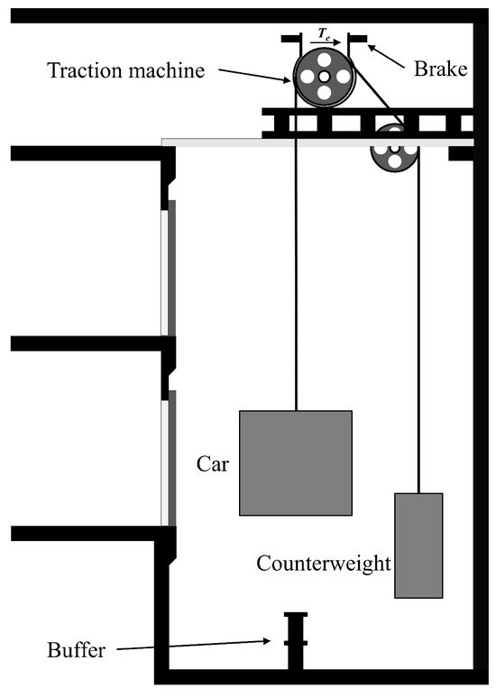 The mechanical construction of elevators varies according to their rated speed and maximum load-bearing capacity. Generally, an elevator with moderate to low speeds (less than 250 m/min) mainly consists of four components: a traction machine, an elevator car, a traction sling, and a counterweight. The elevator car is responsible for transporting passengers or goods vertically. At the same time, the counterweight serves to balance the car mass, thereby reducing the torques needed for the machinery to operate efficiently. A motor is utilized to drive the pulley surrounded by the sling, which connects the elevator car and the counterweight. The mechanical structure of the elevator system is depicted by a simplified schematic, as shown in Figure 1. Then, a dynamic model of the elevator system can be established by integrating Newton’s law with Hooke’s law via force analysis.