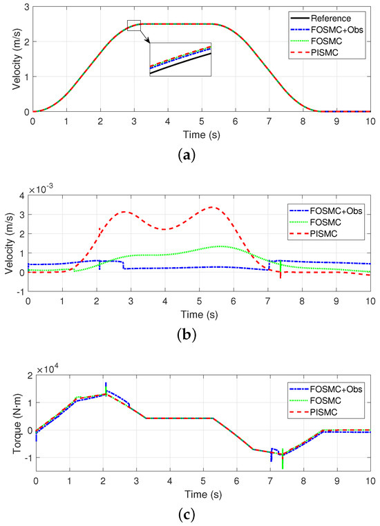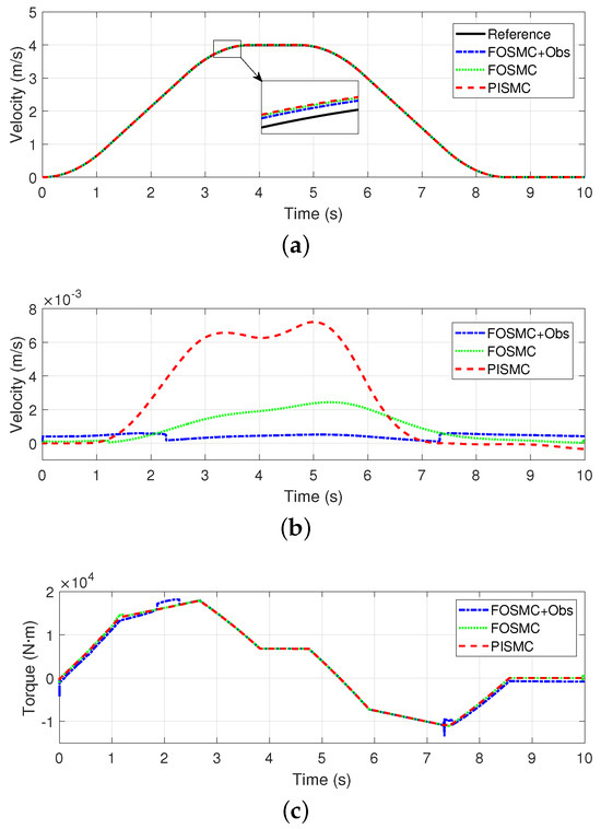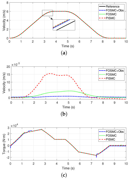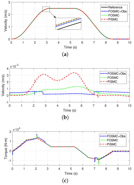 Figure 5b shows the tracking errors of all the controllers. We can see that the error of FOSMC + Obs remains the smallest, especially during the acceleration and deceleration phases. The error of FOSMC remains at a relatively low level. The error of PISMC is still the largest in this case, especially during the starting and stopping phases.