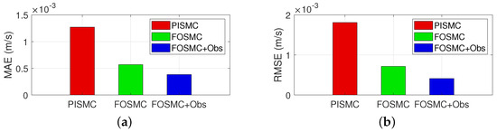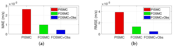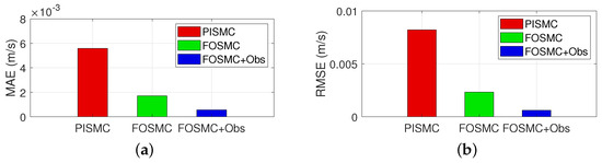 Figure 8 shows the MAE and RMSE of the three controllers in Case 3. It can be seen that FOSMC + Obs reduces 55.74% and 83.57% in MAE and 65.30% and 88.41% in RMSE compared with FOSMC and PISMC, respectively. Then, the superiority of the proposed control scheme is illustrated more comprehensively.