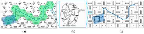 where refers to the circumscribed circle of the triangle. , , and are the angular speeds of the wheels. It is seen that the transformation matrix of (4) is singular, and the rank is equal to two rather than three, making the third type of wheel pattern infeasible for all translational movements and rotations. However, according to the cellular conveyor layout, adding one wheel to the infeasible pattern to form a diamond wheel pattern with four wheels results in a feasible pattern. This is because any adjacent triangular pattern to the infeasible pattern in Figure 3c is one of the feasible patterns in Figure 3a,b. As shown in Figure 3d, though the triangular pattern ABC is infeasible, with one extra wheel, the adjacent wheel patterns ABF, ACE, and BCD are feasible. As a result, all of the diamond wheel patterns with four wheels are feasible. However, because the patterns in Figure 3b,c are oriented rather randomly compared to the pattern in the hexagon module as in Figure 3a, the actual control and analysis of the conveyor based on the two patterns are rather difficult, if not impossible. As a result, according to the literature [1,5,20], the path planning was conducted only in a module-to-module manner.
