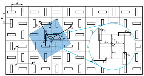 where refers to the serial number of rows of horizontal wheels or columns of vertical wheels counting from the center of the box. For example, represents the nearest wheels to the box center. and () are rotational velocities of the horizontal and vertical wheels, respectively. is the wheel distance in both horizontal and vertical directions. and () denote the horizontal and vertical positions of the vertical and the horizontal wheels with respect to the box center when equals zero, respectively. and () calculate the horizontal and vertical positions of the vertical and the horizontal wheels with respect to the box center, is the radius of the omni wheel. Equation (1) can be rewritten as , where and refer to the wheel and box velocity vectors, respectively. is the box position and orientation vector, written as . represents the transformation matrix. Clearly, the transformation matrix is redundant, and the rank is three. The redundant wheels provide stable support for the box. In contrast, the existing cellular conveyor has a basic module with three wheels, and the kinematics is not redundant.