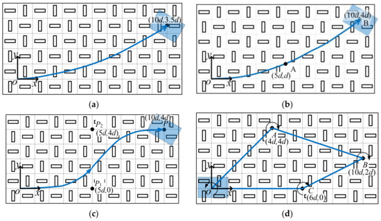 The fourth type of trajectory generation problem concerns the box passing through a set of via points that are connected through straight lines. The orientation of the box remains unchanged when moving along the straight lines until it comes to rest at each via point. The orientation of the box only changes at the initial and via points to make the orientation of the box the same as the incline angle of the next straight-line segment, as shown in Figure 4d. In this case, the translational and rotational motions are separated. A constant rotational velocity of 1 rad/s at the stopping points is assumed to simplify the trajectory planning. Cubic polynomials are used for the line segments, as in (14)–(19).