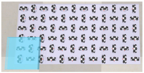 The omni wheels and the platform are set as non-respondable to each other, thus simplifying the cuboid body structure design and decreasing computational cost. The schematic top view of the conveyor is presented in Figure 5, where the wheel’s horizontal and vertical distances are all equal to . The box is modeled as a cuboid directly with an edge size equal to and its radius of inscribed circle is , slightly larger than in order to ensure that everywhere on the conveyor is feasible for trajectory generation. is the minimum size of the box to ensure that everywhere on the conveyor is feasible to move and rotate. Detailed feasible areas are depicted in Section 5 and Section 6.