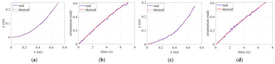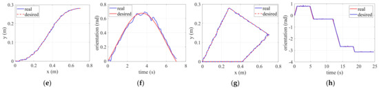 The snapshot of the final trajectory planning result is depicted in Figure 7. The actual trajectories are depicted in red color. During the simulations, only the wheels covered by the box rotate while other wheels remain stationary to reduce the computational and simulation time. The simulation time interval is set to 0.05 s for one cycle of computations. The PID gains for directions , and rotation are (1, 1, 1.5), (2, 1.5, 1.5), and (2, 1, 1.8), respectively. The same PID gains are used for other trajectories. Figure 8 illustrates the trajectory following results for the four trajectory cases, in which it shows that the actual and desired trajectories and orientations agree well with each other.