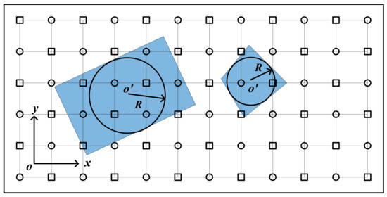We have seen in previous sections that the proposed omnidirectional conveyor is feasible for the transfer and rotation of the box. Clearly, when the box is moving, the number and patterns of covered wheels may change. The number and patterns of the covered wheels may also be different for different sizes of the boxes, as shown in Figure 9. In Figure 9 and hereinafter, we used a small square and a circle to replace the omni wheels for simplicity, such that the squares and circles represent horizontal and vertical wheels, respectively, or vice versa. In this work, an inscribed circle located at the center of a box is used to represent the shape and size of a box, as shown in Figure 9. The inscribed circle is used as the representation circle because if the inscribed circle can cover a particular wheel pattern that is feasible for moving and rotating the circle, then the actual wheel pattern that the original box covers is apparently feasible. The inscribed circle ensures that the wheel pattern remains unchanged with the change in box orientation.