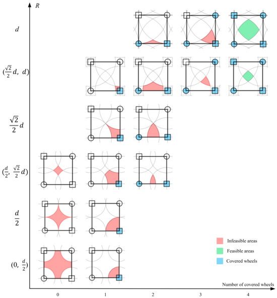 It is seen from Figure 10 that when the radius of the inscribed circle is less or equal to the wheel distance , the number of covered wheels is never above four. Obviously, wheel patterns with 0, 1, 2, and 3 wheels are incapable of driving the box to any translational and rotational velocities and hence infeasible. When the radius of the inscribed circle of the box is equal to , only the central area is feasible as it has four wheels. However, since its feasible area is surrounded by infeasible areas, the overall conveyor is infeasible for generating an actual trajectory. As a result, when the radius of the maximum inscribed circle is no larger than , the conveyor cannot be used. In other words, if the horizontal or vertical wheel distance exceeds the radius of the inscribed circle , then the conveyor is unusable. The red and green colors refer to the infeasible and feasible areas, respectively.