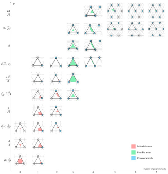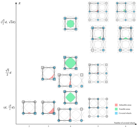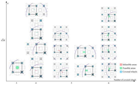 Similarly, as shown in Figure 11, when the radius of the inscribed circle is smaller than , new wheel patterns appear with four and five wheels. However, the newly emerged pattern is also infeasible, for there is only one horizontal wheel with three or four vertical wheels (or only one vertical wheel with three or four horizontal wheels). Only feasible areas occur around the center of the four-wheel square, but these feasible areas are isolated by infeasible areas, which is the same as in Figure 10, making the whole conveyor infeasible. When the radius of the inscribed circle is equal to , the central feasible areas are connected to each other via a point. It is critically feasible to use the conveyor. When the radius of the inscribed circle increased to be in the range of , new wheel patterns of five and six wheels emerge. The newly emerged patterns turn out to be feasible and adjacent to the feasible area of the four-wheel pattern. In this case, the conveyor has a whole connected feasible area, and the box can be transferred to this combined area. However, the connecting areas are narrow compared to the wide feasible area of the four-wheel pattern. The box has to move precisely in those narrow areas, and a possible deviation can cause it to move to the infeasible areas.