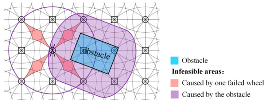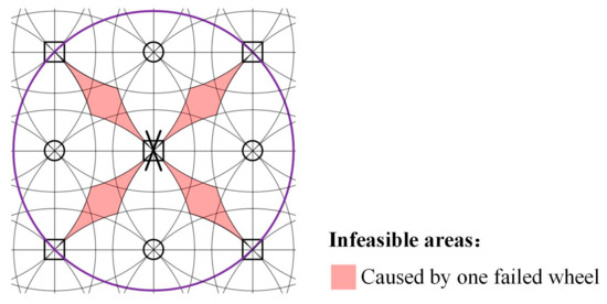 It can be seen from Figure 14 that new wheel patterns emerged due to the loss of the failed wheel. The feasible and infeasible areas are shaded with green and red, respectively. The areas with identical wheel patterns are not presented in Figure 14 to avoid complexity. Combined with the infeasible areas, the whole infeasible area in red is depicted as shown in Figure 15. Clearly, all the areas within the boundary circle are affected by the failed patterns, but not all of them turn out to be infeasible. The infeasible areas consist of four independent parts with a symmetric layout.